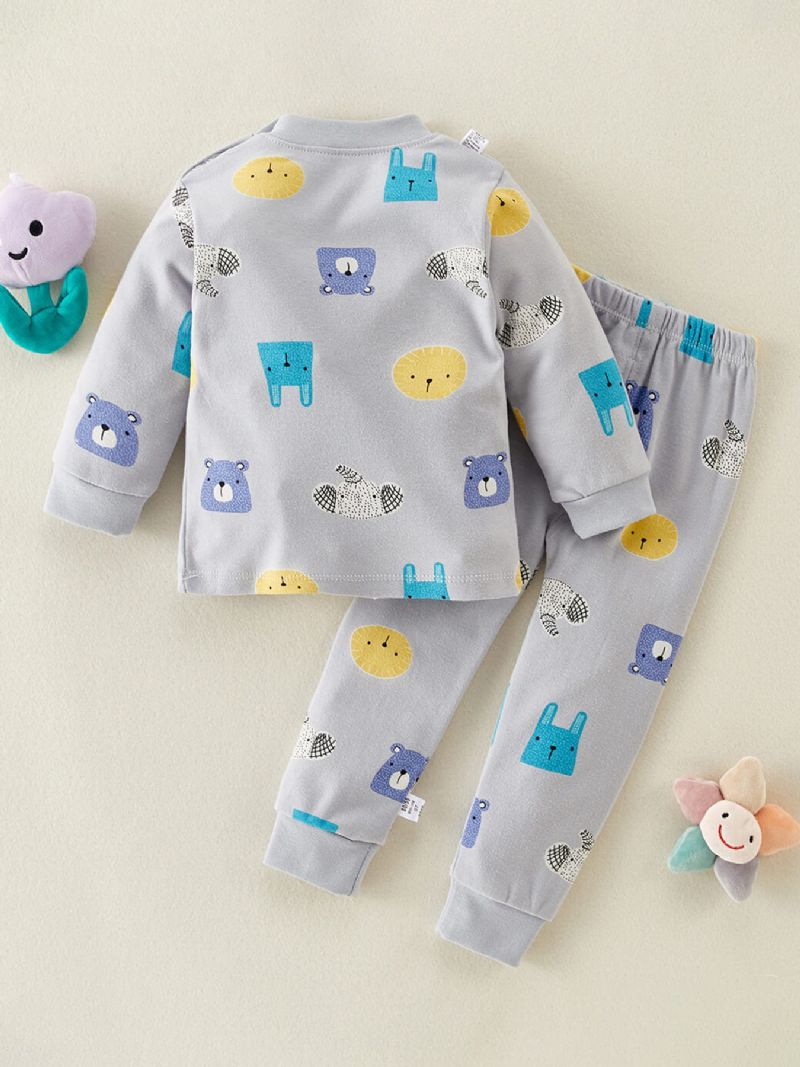 2 Kpl Taaperopojan Puuvillainen Söpö Eläinkuvioinen Toppi Ja Housut Pyjamasetti