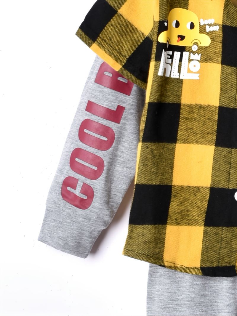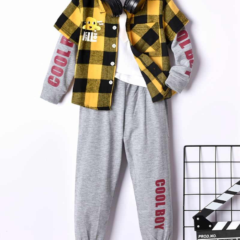2kpl Poikien Housusarja Talvisarjakuva Autoprintti Colorblock Plaid Pitkähihainen Ja Kirjainkuvioinen Solid Housut Setti