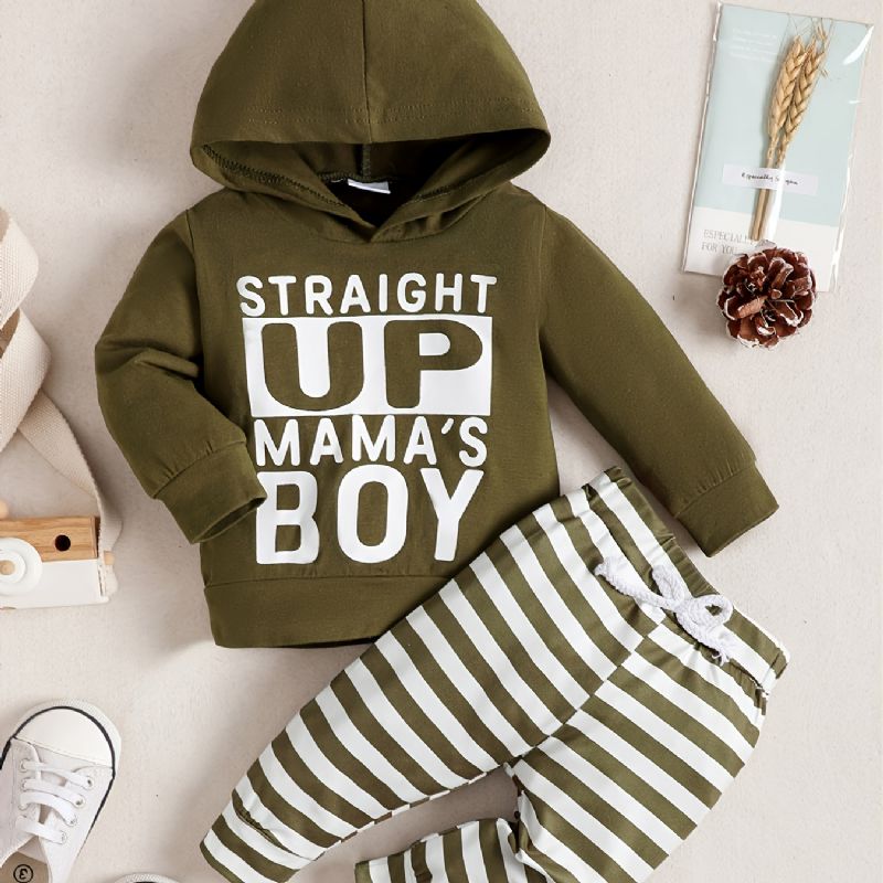 2kpl Syksy & Talvi Poikien Kirjeprintti Yksivärinen Hupullinen Pitkähihainen Paita + Raidalliset Housut