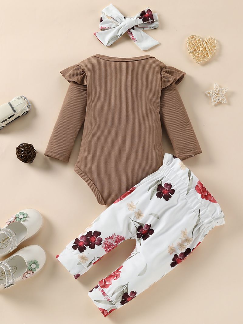 3 Kpl Tytöille Kukkaprintti Röyhelö Pitkähihainen Onesie-setti Päänauhalla