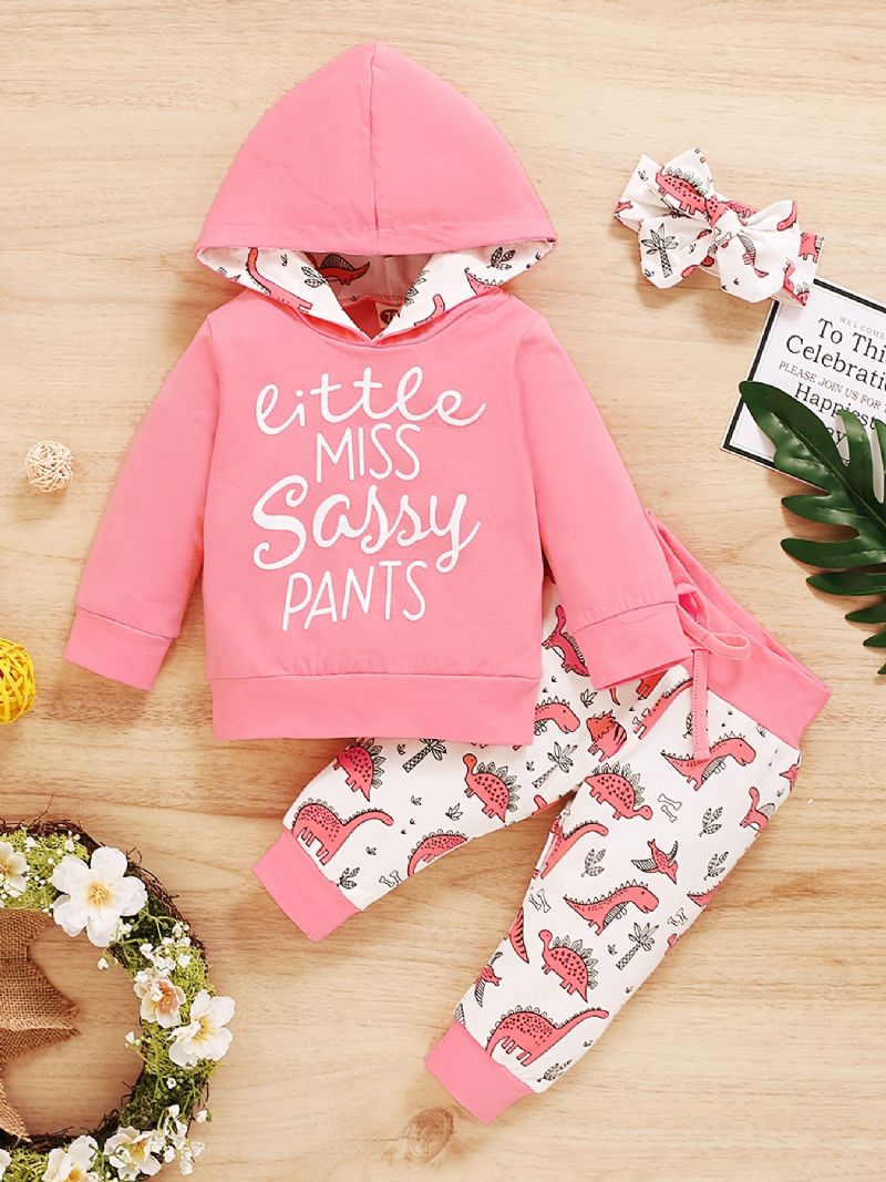 3 Kpl Tyttöjen Pink Letter Print Pitkähihainen Huppari Top Söpö Dinosaur Joustavat Vyötäröhousut Päänauha Setti Vaatteet