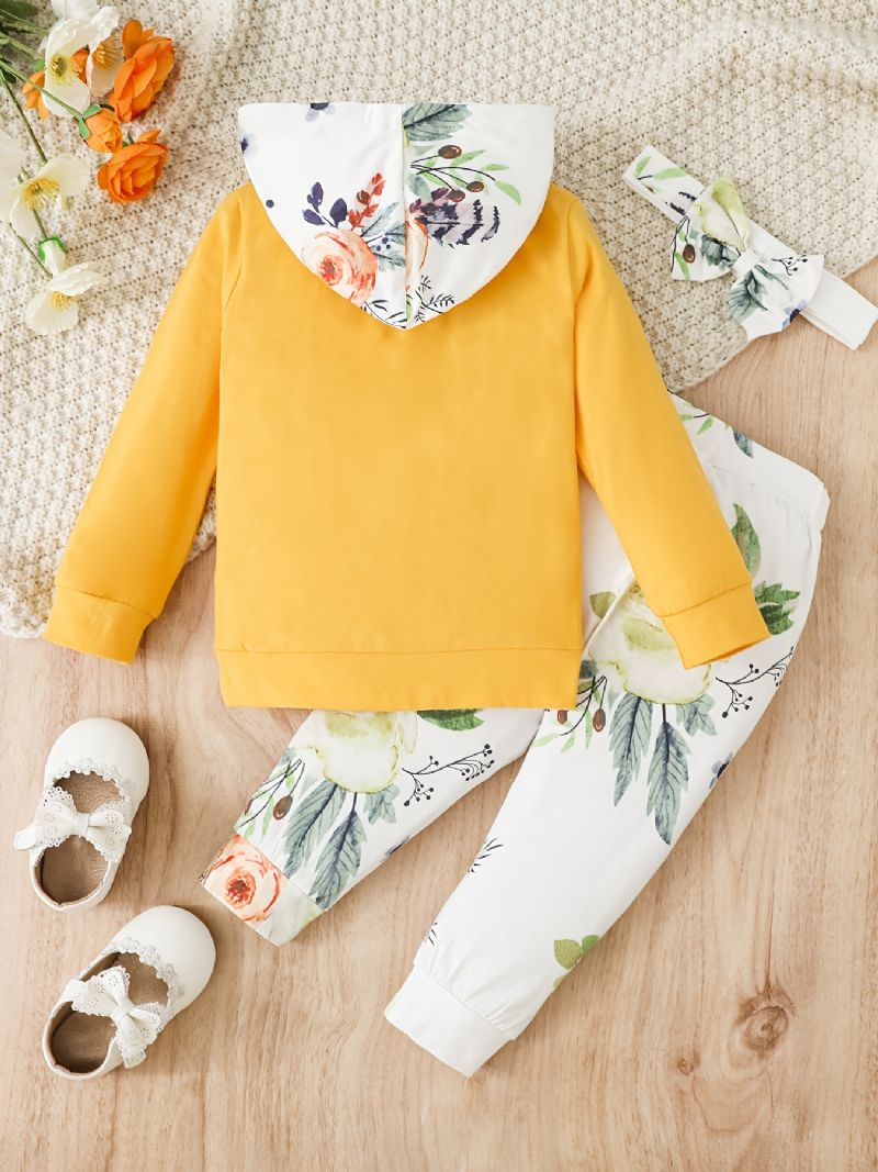 3 Kpl Vauvan Tyttöjen Huppari Kukkakuvioinen Pitkähihainen Villapaita Housut & Päänauha Lasten Vaatesarja