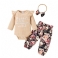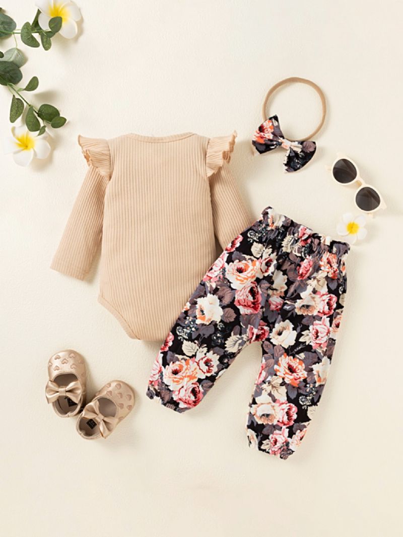 3kpl Syksy & Talvi Tyttövauva Kirjeprintti Kiinteä Pyöreäkaula-pitkähihainen Body Kukkakuvioinen Rento Housut & Rusetti
