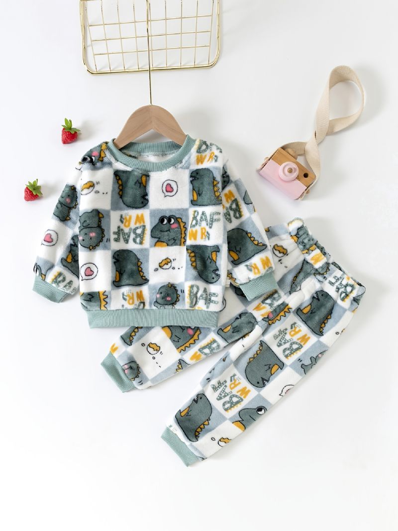 Lasten Flanellipyjamat Söpöt Dinosaurustelineet Pyöreäpääntie Pitkähihainen Toppi & Housut Vaatesetti Pojille Tytöille