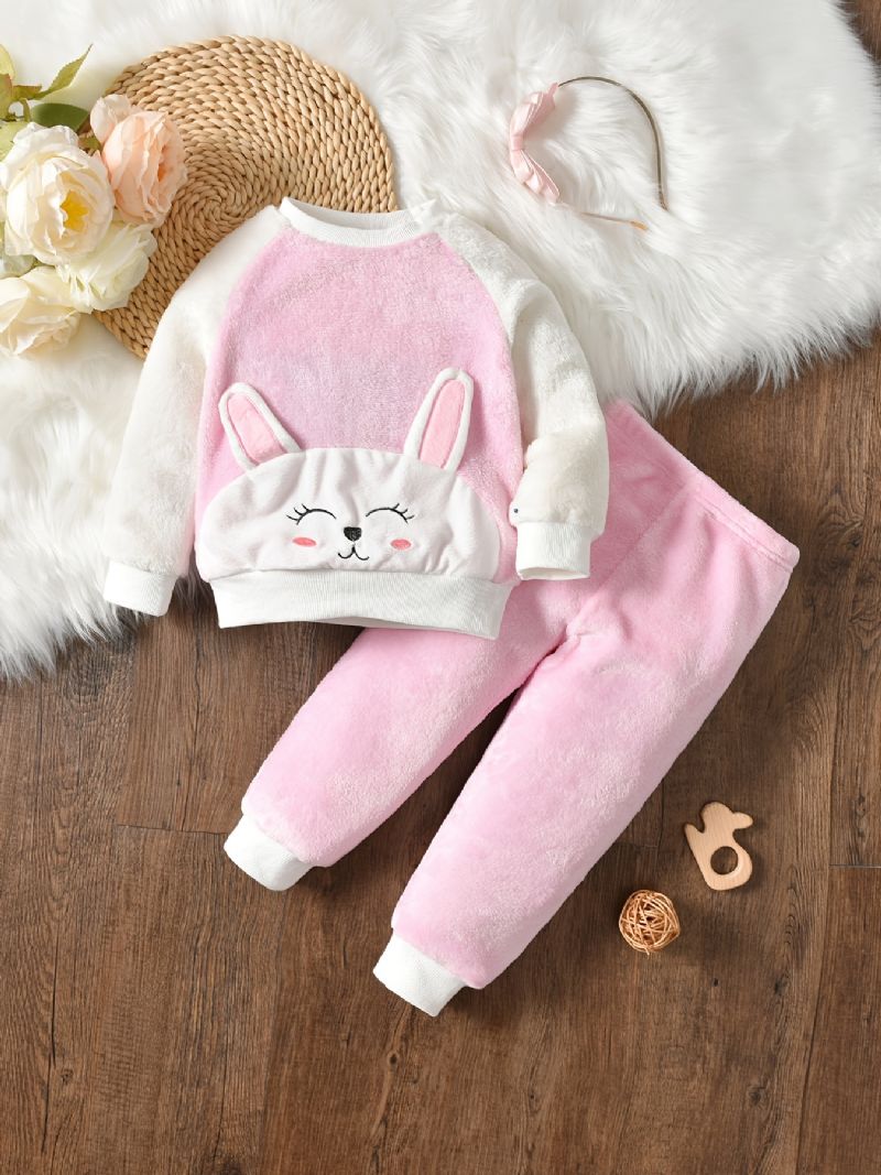Lasten Flanellipyjamat Söpöt Jänikuvioiset Pyöreäpääntie Pitkähihainen Toppi & Housutsetti Pojille Tytöille