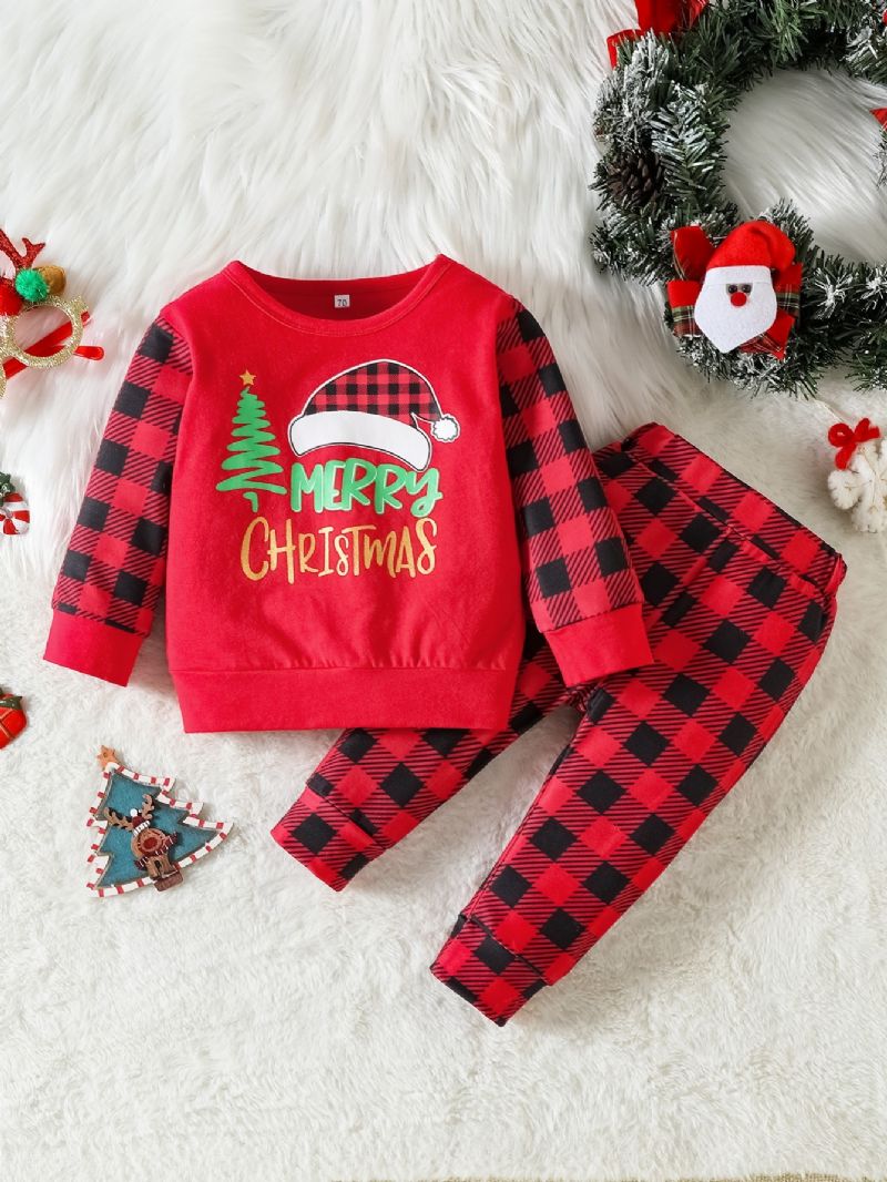 Lasten Joulukuusiprintti Punainen Mustaruudullinen Villapaitasetti