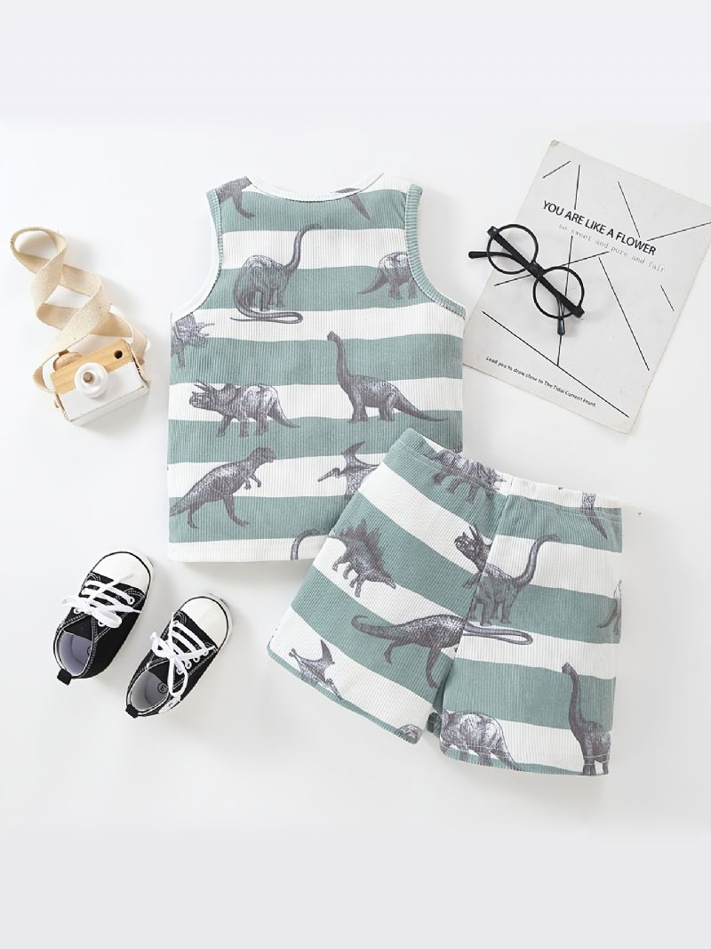 Poikien Dinosauruskuvioinen Raidallinen Toppi + Shortsit Taskusarjalla Lasten Vaatteet Kesäksi