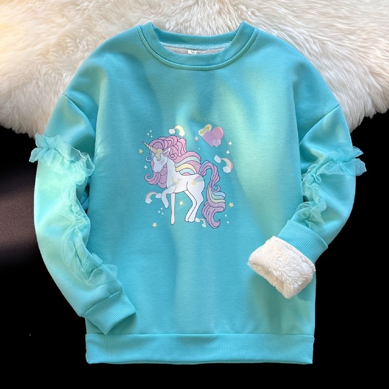 Tytöt Yksisarvinen Printti Fleece Paksuuntuva Lämmin Villapaita Pyöreä Kaula Pitsi Tikkaus Pitkähihainen Collegepaita Syksy Talvi