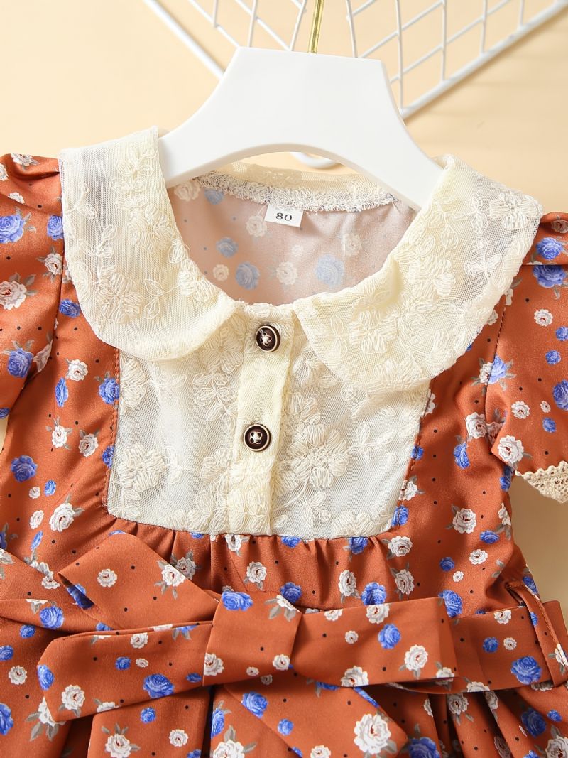 Tyttöjen Nukkekaulus Lyhythihainen Pitsiliitos Mekko Kukkaprintti Vyöllä Lasten Vaatteet