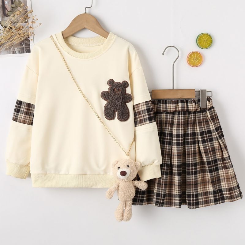 Tyttöjen Pyöreäpäällinen Karhupusero Ja Ruudullinen Hame Ja Karhutarvikkeita