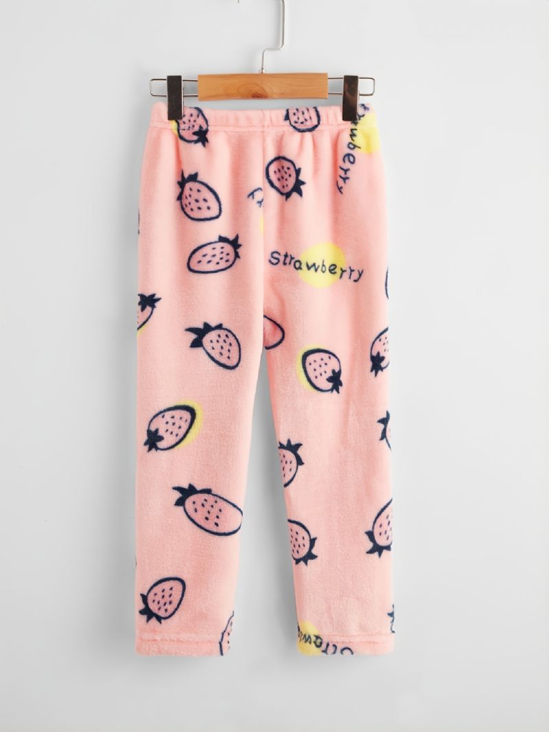 Tyttöjen Söpö Mansikkakuvioinen Flanelli Pitkähihainen Lämmin Pyjamasetti Vaaleanpunainen