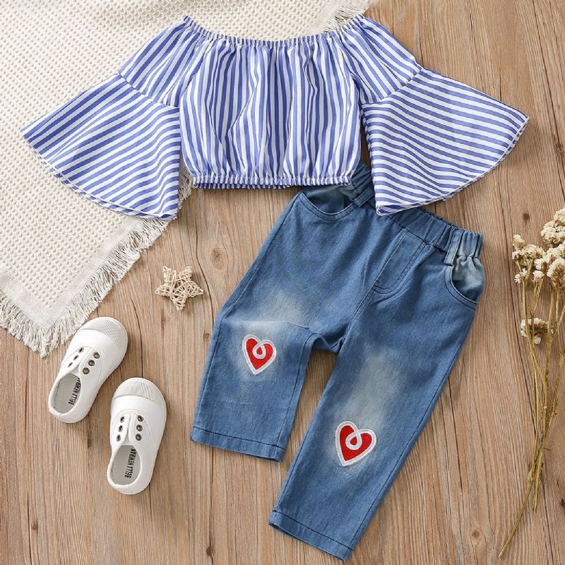 Tyttöjen Yhden Olkapään Raidallinen Levenevä Hihainen Toppi Ja Brodeerattu Sydänfarkkuhousut