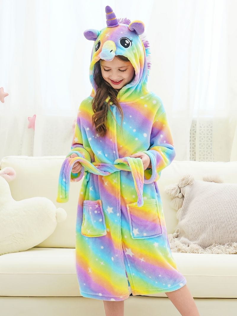 Tyttöjen Yksisarvinen Hupullinen Flanellikylpytakki Kirkas Rainbow Pehmo Lämmin Pyjamat Kotiasu Taskulla Talvi