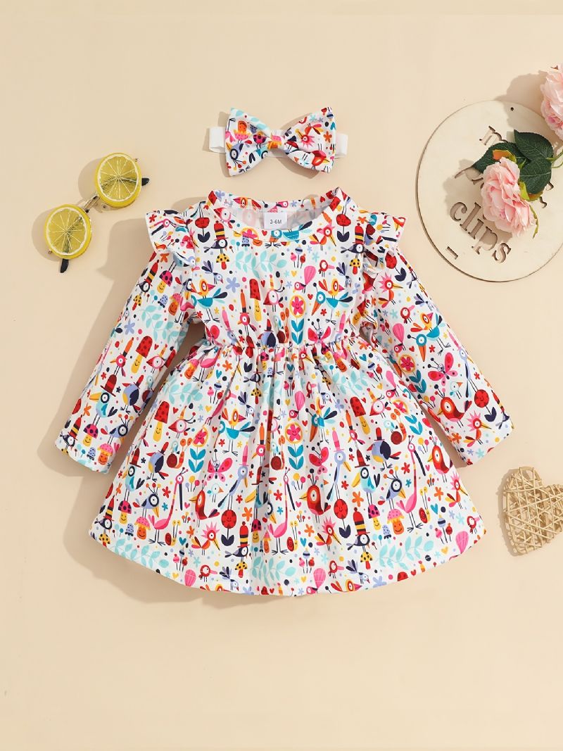 Tyttövauvojen Rento Sarjakuva Abstrakti Printti Röyhelöinen Mekko Ja Rusetti Otsanauha Juhliin